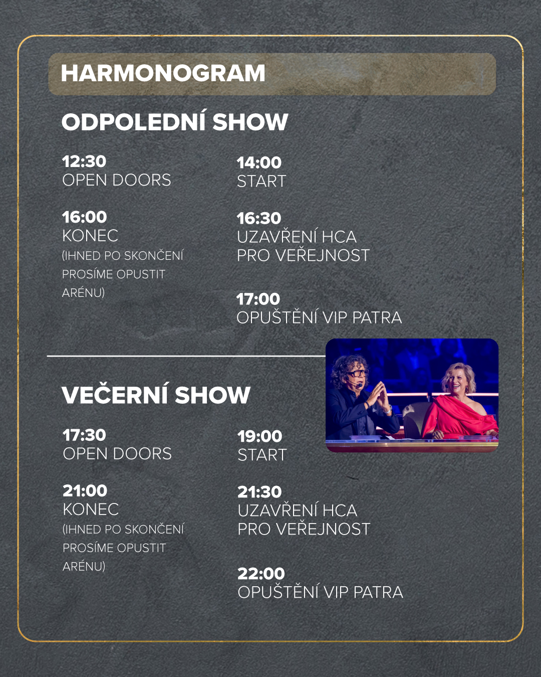 Dvouhodinová show, kterou vás provedou legendární moderátoři Marek Eben a Tereza Kostková.