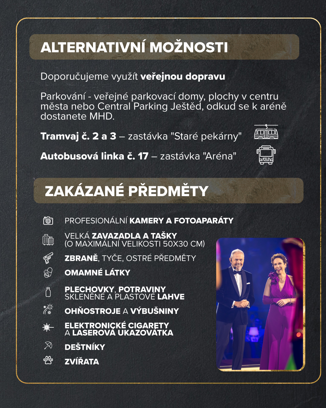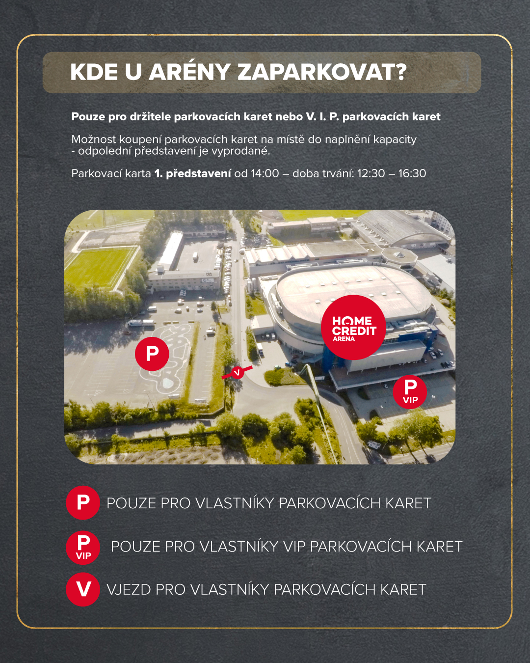 - Parkovací karta je platná pouze po dobu trvání Vámi zvoleného představení (od otevření arény do skončení akce).