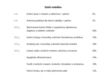 Připravujeme šťavnaté burgery, pečené brambory, čerstvé sendviče a denní polévku, kterou několikrát do týdne obměňujeme, aby bylo vždy z čeho vybírat. Ke kávě si můžete dopřát také výborné zákusky a dorty, které potěší každého milovníka sladkého.